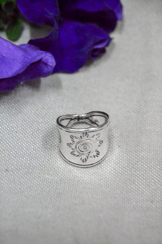 Anillo Garam hecho en plata de ley con un tallado minucioso en el centro, de un sol. Precioso anillo que lo puedes lucir con muchos otros complementos.