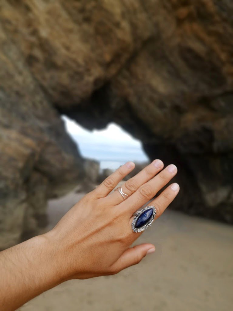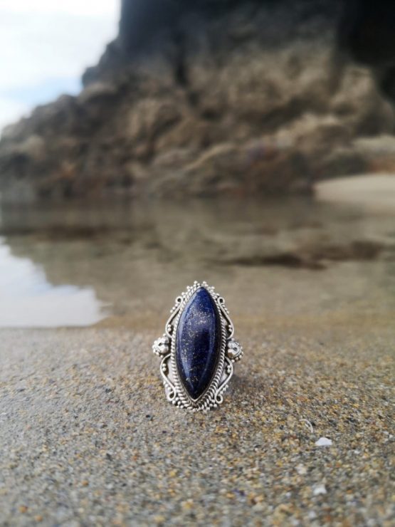El anillo Neela es un anillo de Piedra Lapislázuli Natural y Plata de Ley 925. Esta joya hecha mano es muy bonita y original, su color azul marino nos lleva a pensar en las profundidades del mar.
