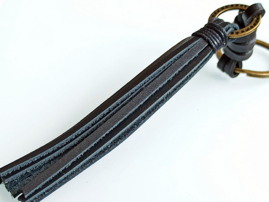 Llavero de cuero negro formado por varias tiras, en forma de flecos de cuero unidas con un nudo.