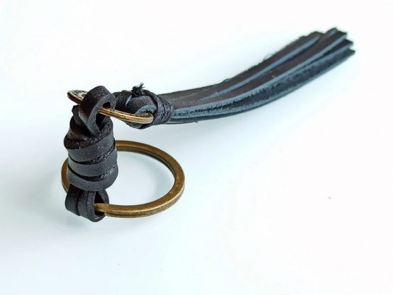 Llavero con flecos de cuero en color negro. Este llavero es ideal para los amantes de la naturaleza y que buscan un accesorio diferente para sus llaves.