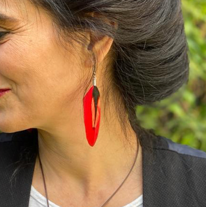Pendientes de pluma Roja decorados con plumas más pequeñas de otros colores.