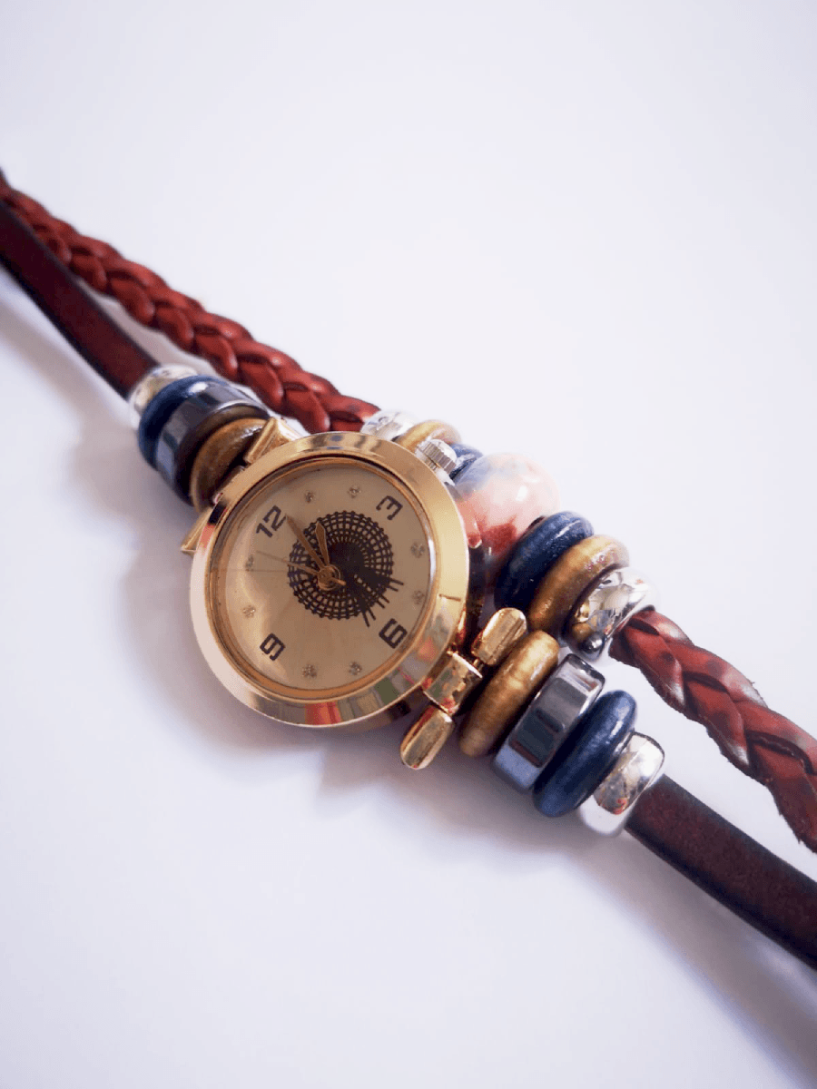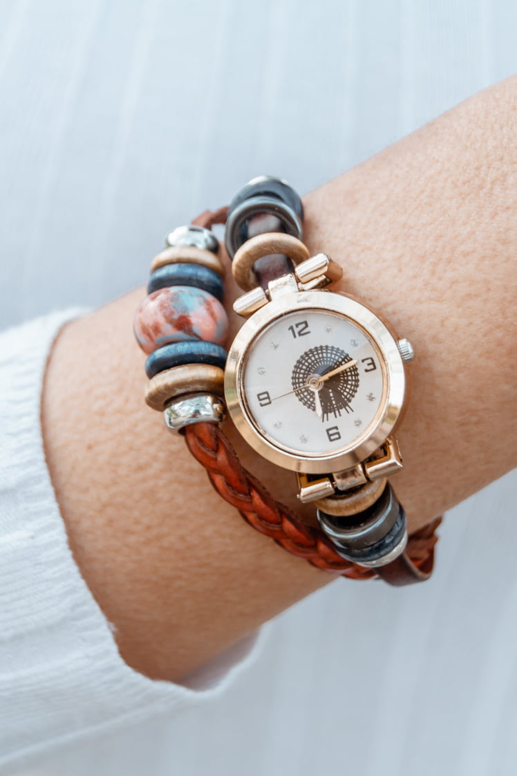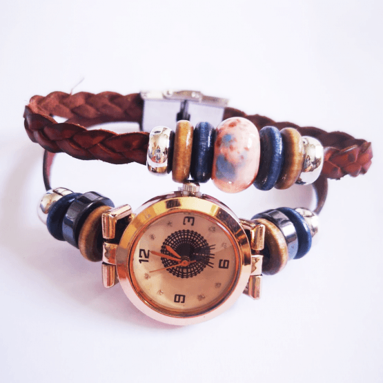 Este reloj está hecho con mucho cariño y se ha decorado con una doble correa que está formada por una pulsera de cuero trenzado.